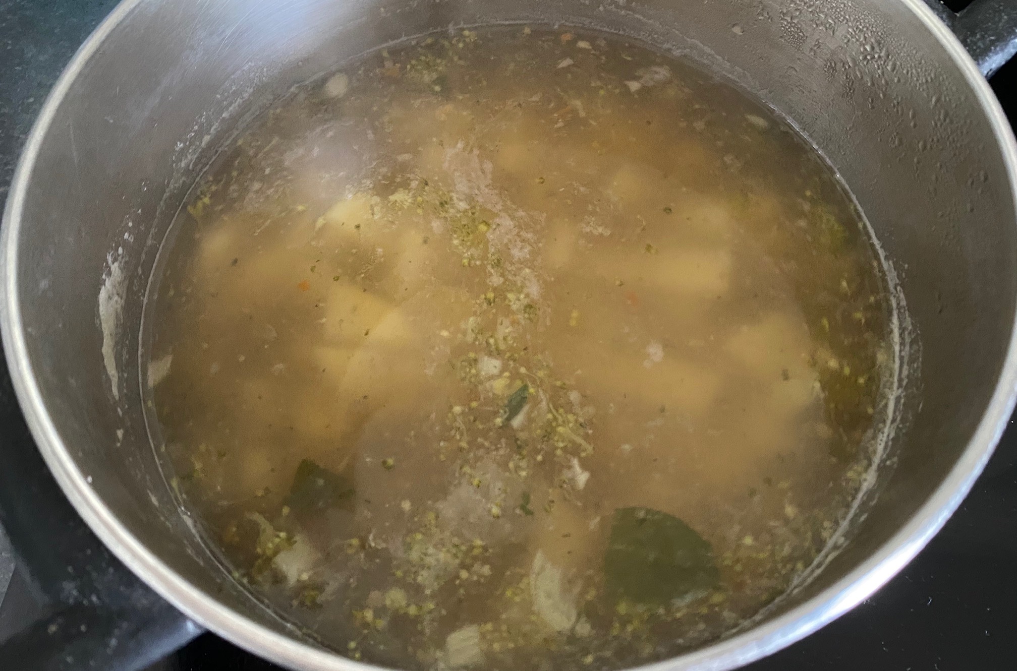 - In a medium size cooking bowl at the chicken broth together with the chicken and potato pieces and let it cook on high heat for about 6 – 10 minutes until potatoes are soft.